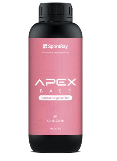SprintRay APEX Base je nanokeramická, biokompatibilná živica triedy II s certifikátom FDA, určená na 3D tlač snímateľných báz zubných protéz. Využíva inovácie biomateriálov na zlepšenie 3D výroby a opravy úplných a čiastočne snímateľných zubných protéz a bázových platničiek. APEX Base, poháňaná patentovanou technológiou NanoFusion™ a prekonávajúca normy ISO pre vysokú odolnosť voči nárazu, je napustená optimálnym množstvom keramiky, vyniká v odolnosti voči lomu a opotrebovaniu a prekonáva konkurenčné 3D tlačené a frézované materiály vo viacerých ohľadoch. APEX Base sa vyznačuje vylepšenou priesvitnosťou pre konkurencieschopné estetické 3D tlačené zubné protézy. Súčasť plne integrovaného digitálneho pracovného postupu SprintRay, ktorý zahŕňa služby návrhu zubných protéz na mieru na požiadanie a špičkový ekosystém 3D tlače.