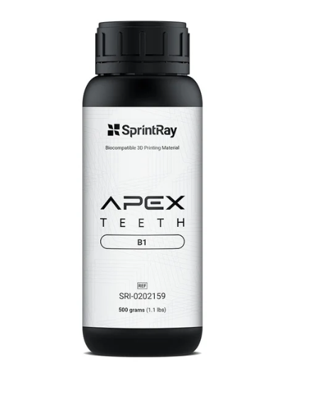 SprintRay APEX Teeth: biokompatibilná živica na 3D tlač zubných protéz. Prekračuje vysoko odolné normy ISO pre mechanické vlastnosti. Odtiene: A1, A2, B2 a Bleach.