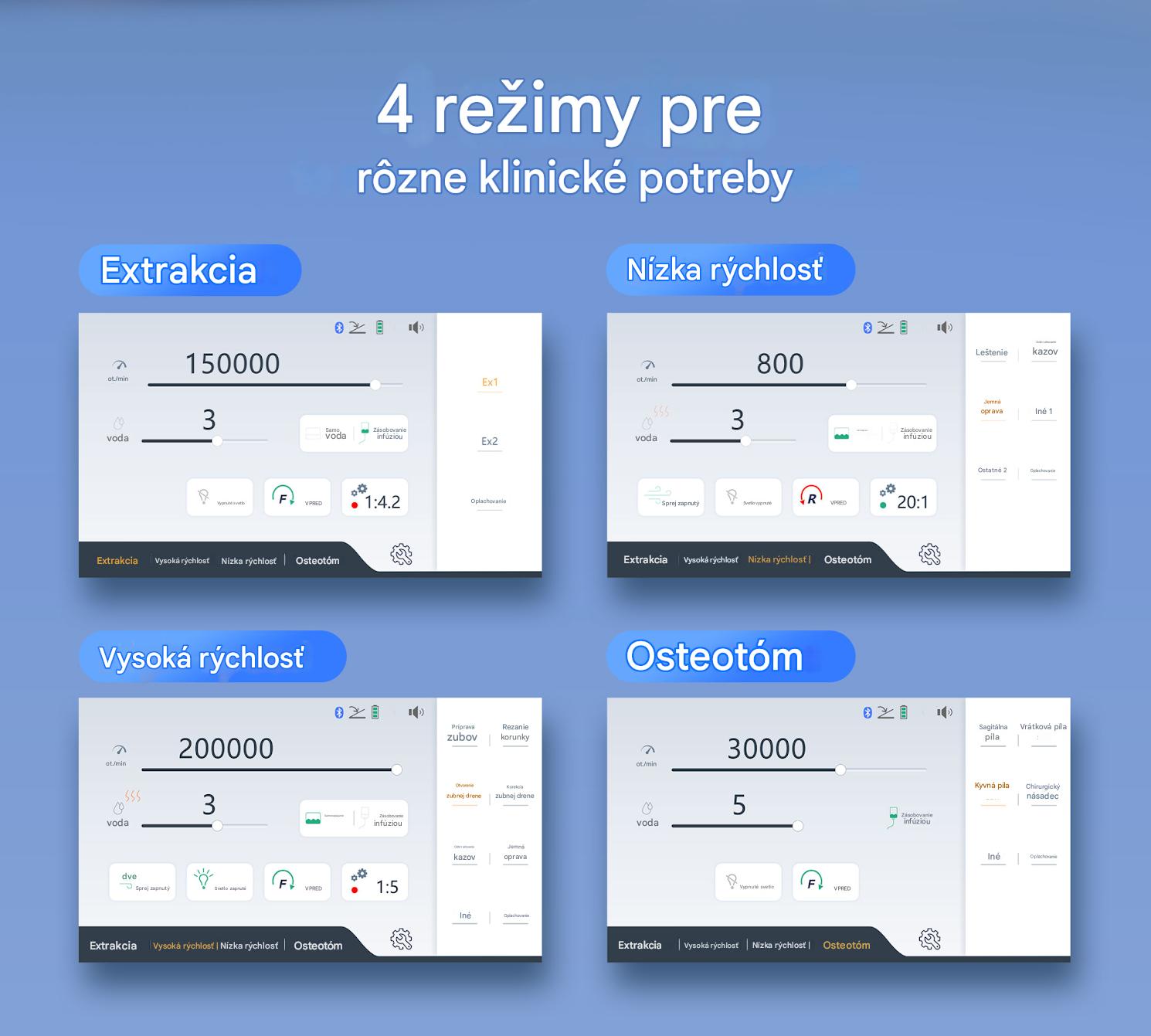 Štítok lingxing Multifunkčný extrakčný osteotóm ponúka štyri režimy – vysokorýchlostný a nízkorýchlostný – aby spĺňal rôzne klinické potreby.