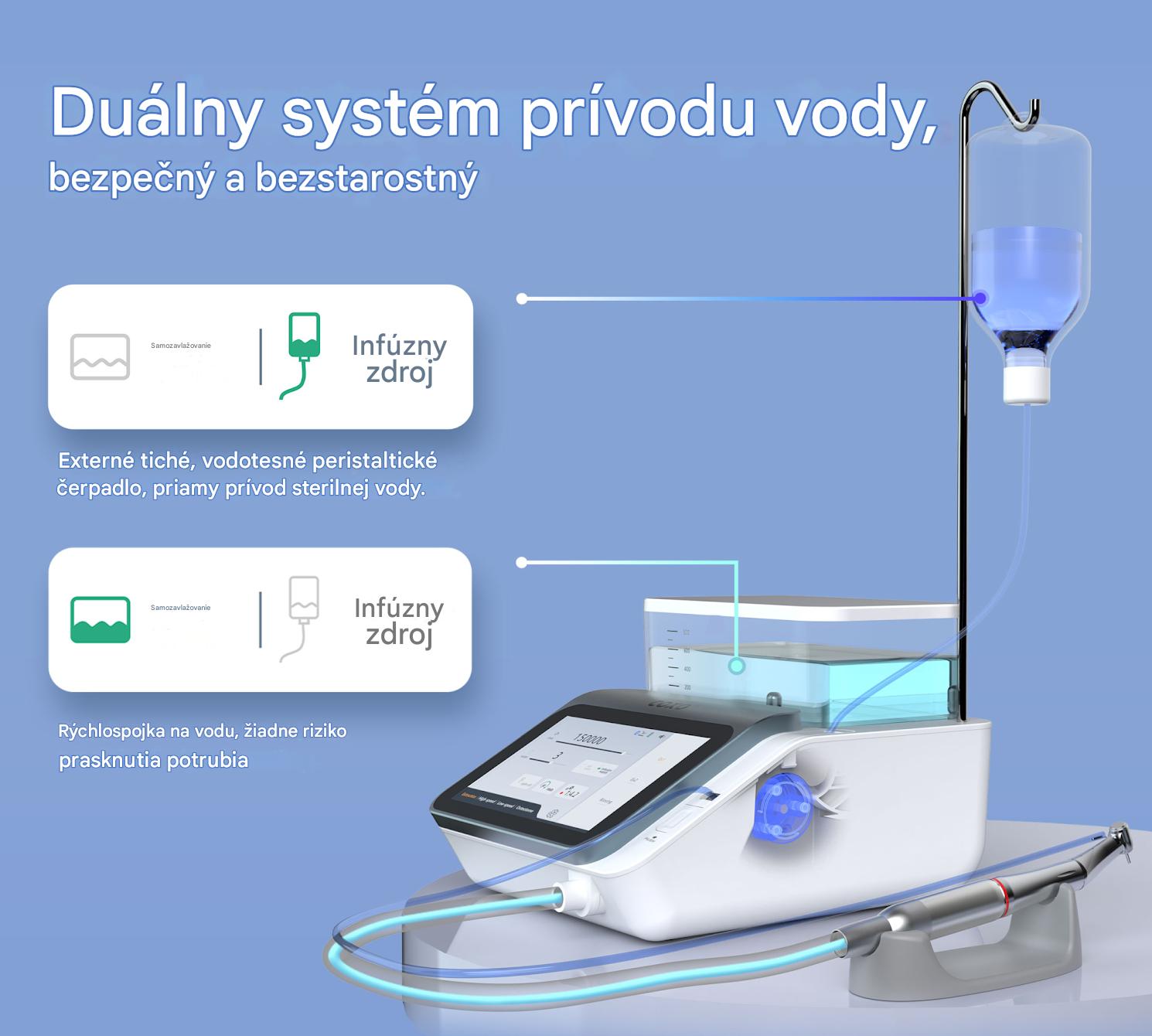 Dvojitý prívod vody: Obsahuje externé, tiché a vodotesné peristaltické čerpadlo na priame dodávanie sterilného chladiaceho fyziologického roztoku.