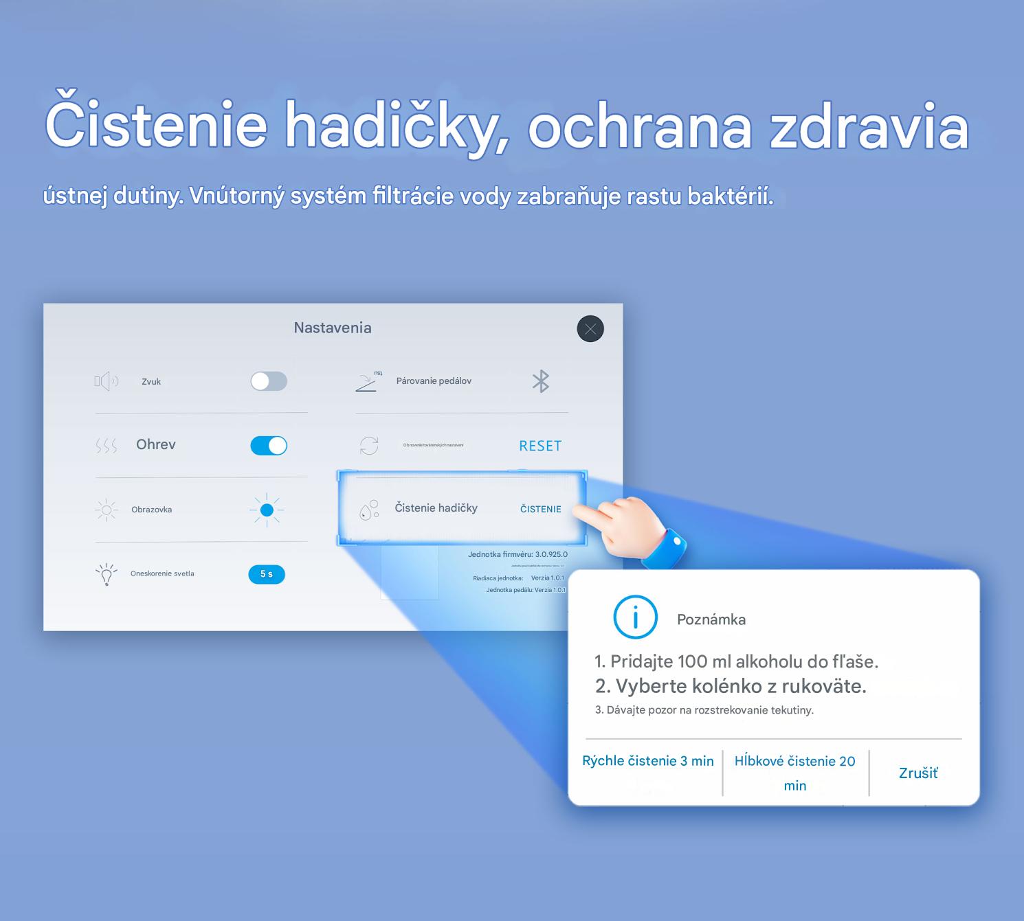 Vysokokapacitná a hygienická nádrž: Využíva 1000 ml rýchlopripojovaciu nádrž na vodu so zabudovaným filtračným systémom, ktorý zabraňuje rastu baktérií a krížovej kontaminácii.