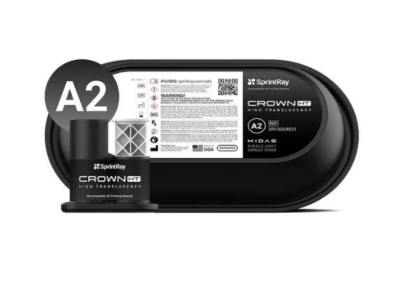 Kapsule Crown HT sú dostupné exkluzívne pre digitálny lis SprintRay Midas v odtieňoch A1, A2, B1 a Bleach a pre optimálne výsledky vyžadujú polymerizačnú jednotku SprintRay NanoCure.“