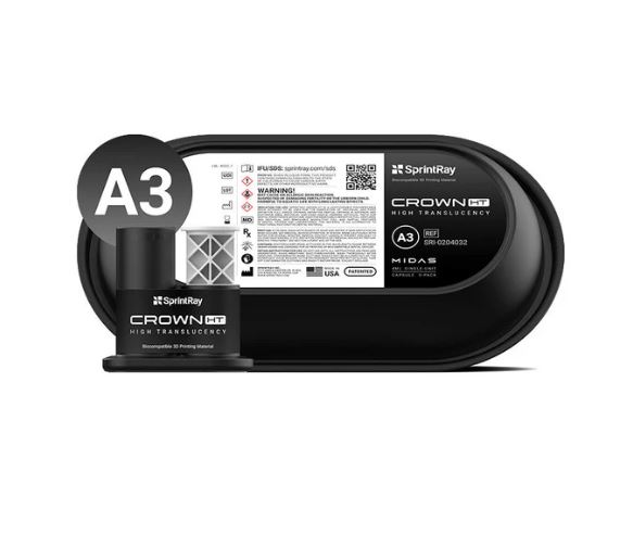 Kapsule Crown HT sú dostupné exkluzívne pre digitálny lis SprintRay Midas v odtieňoch A1, A2, B1 a Bleach a pre optimálne výsledky vyžadujú polymerizačnú jednotku SprintRay NanoCure.“