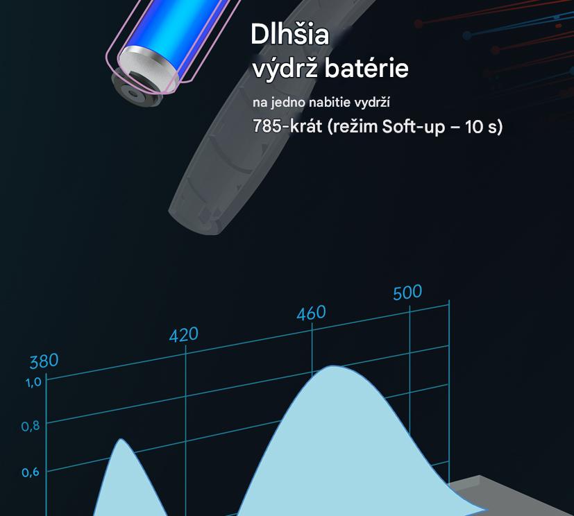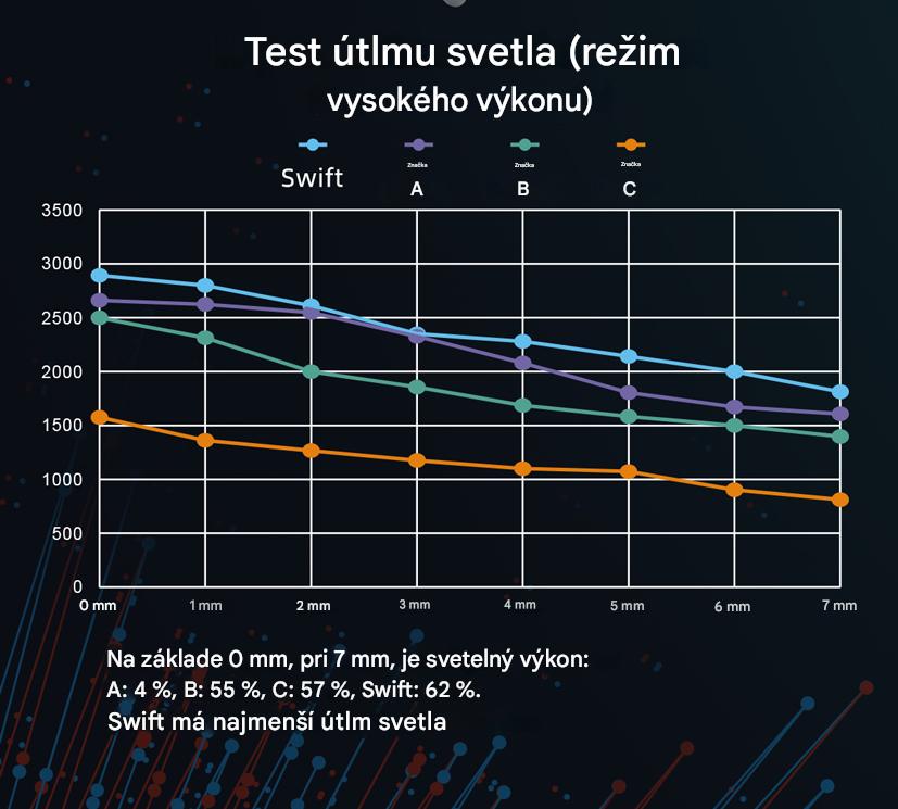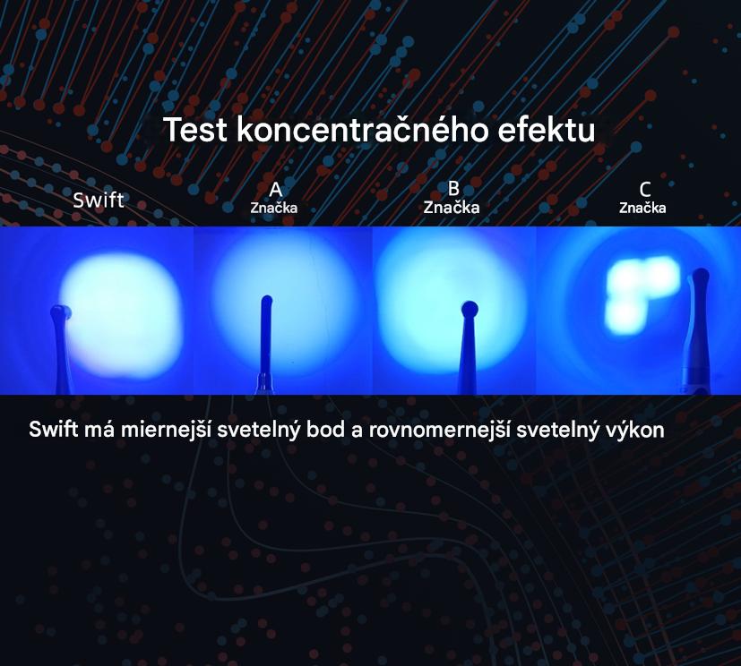Vysoká intenzita svetla zaisťuje dostatočnú hĺbku vytvrdzovania a tvrdosť. Intenzita svetla Swift dosahuje až 3000 mw/cm2.