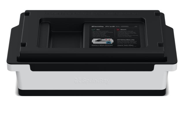 Štandardná nádrž na živicu Pro 2 pojme až 500 ml tekutej živice na tlač. Má ergonomický dizajn s extra veľkými rukoväťami, ľahkou konštrukciou a tesniacim vekom. Vstavaná elektronika sleduje spotrebu a typ živice s očakávanou životnosťou až 30 litrov na tlač. Kompatibilná s 3D tlačiarňou SprintRay Pro 2.