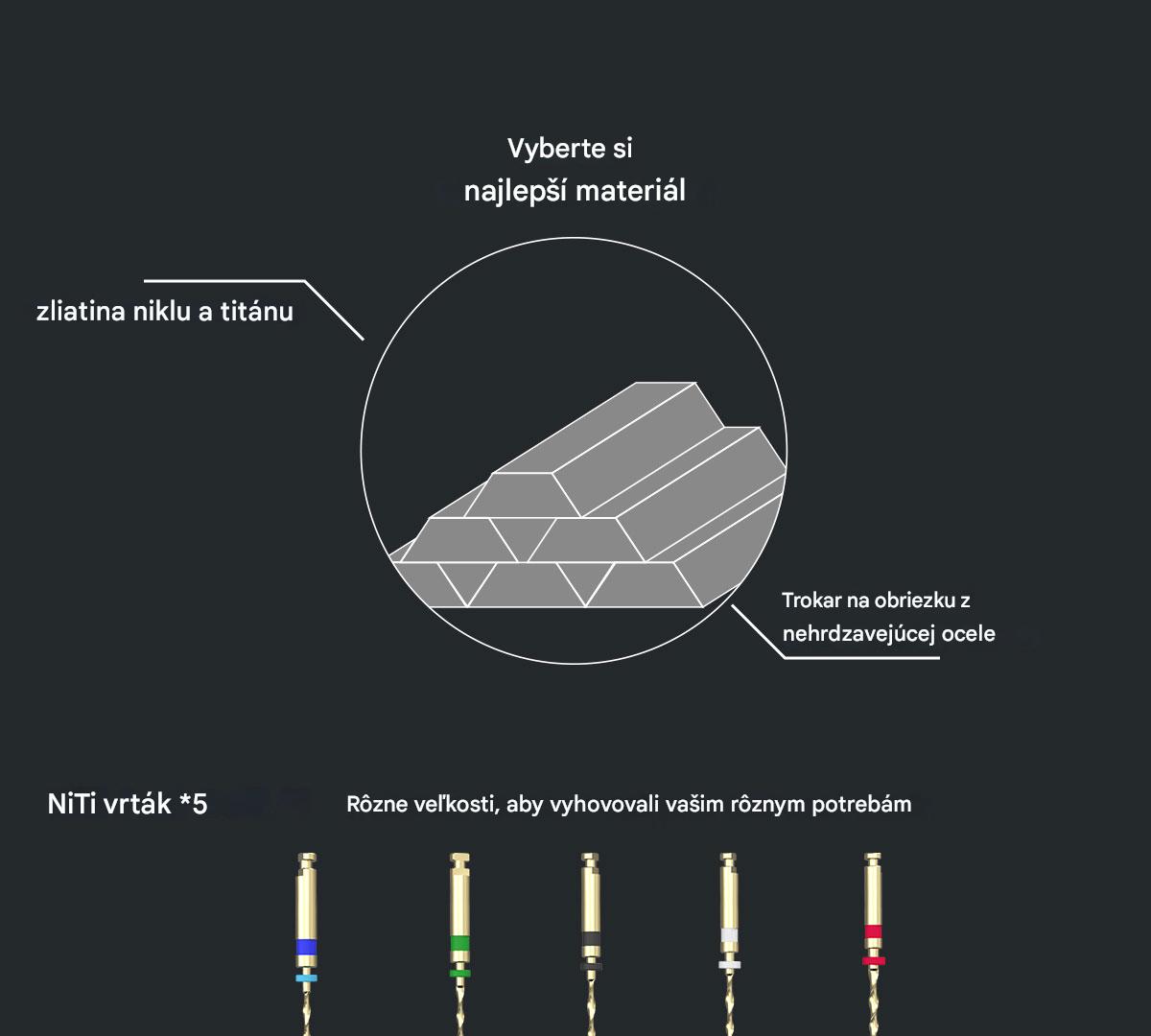 3) Tri upínacie pracovné hroty s vnútorným priemerom na zvládnutie rôznych klinických situácií.