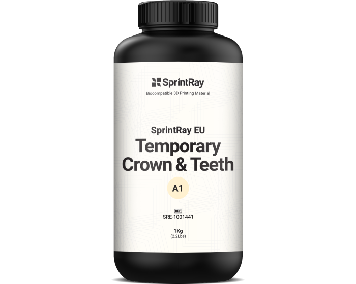 SprintRay Temporary Crown & Teeth je biokompatibilná živica určená na 3D tlačenú výrobu dlhodobých dočasných výplní (koruniek a mostíkov alebo dočasných výplní vo prednej oblasti).